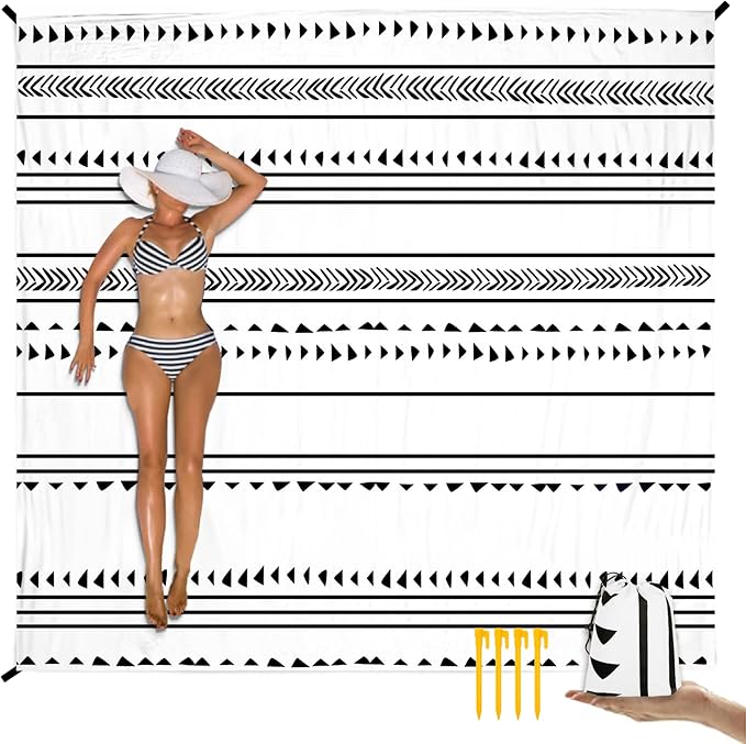 - Wind Resistant : Our white geometric style beach blanket comes with 4 anchor stakes and 4 sand pockets. On windy days, if you don't have a lot of stuff on your beach mat, just fill the built-in corner pockets with sand to weigh it down or use the four included stakes to keep it in place.