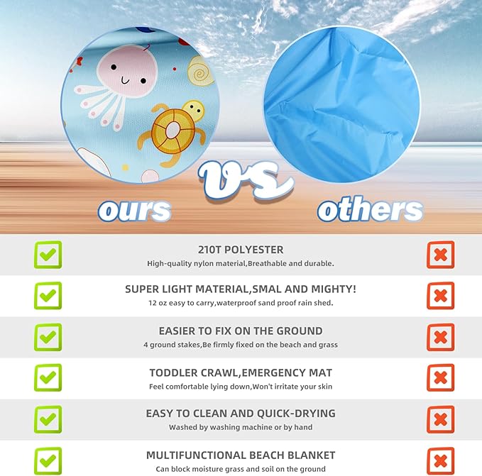 - 🛒Beach Picnic Mat:Package includes 1 beach blanket,4 ground stakes,1 carabiner,Keep out the wind because fixed With 4 fixed anchors,Let your family baby and kids enjoy the beach sea and sunshine together,Please feel free to contact us for service if you have any questions.Including return service.