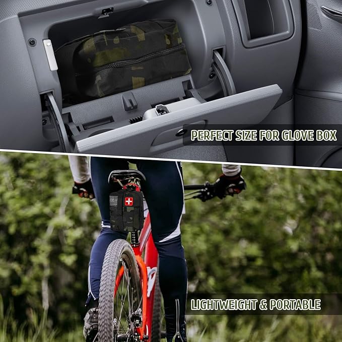 - 【Compatible and Portable】 The military grade MOLLE medical pouch is made of 1000D nylon, which is lightweight and waterproof. Inside the bag, there are three large compartments and several straps, all survival gear and equipment are stored in an organized and easy-to-find manner, making it easy to locate necessary items in an emergency situation. The MOLLE system on the back also allows you to easily attach the kit to your tactical vest, backpack, or belt.