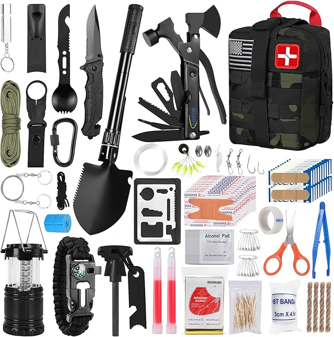 - 【Multiple Survival Gear and Equipment】170pcs survival kits contain: many multi purpose tactical gears, like survival bracelet, folding shovel and pick, 14 in 1 hatchet, wire saw, multifunctional card, parachute cord, etc; Some survival gears for keeping warm and calling for help, like collapsible tent lantern, flint stone & scraper, emergency blanket, dual-tube whistle, light stick; And some fishing tools. It's a comprehensive tactical kit, a great helper of outdoor survival.