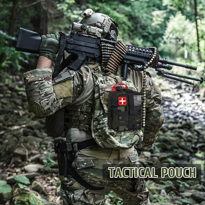 - 【Essential Emergency Medical Supplies】The tactical trauma kit contains 120pcs essential first aid supplies, like bandages, PBT bandage, tourniquet, cotton swabs, safety pins, non-woven medical tape, scissor, tweezers, etc. With the kit, the wound can be treated in time to prevent infection. The trauma kit can help you even save a life in wild emergencies.