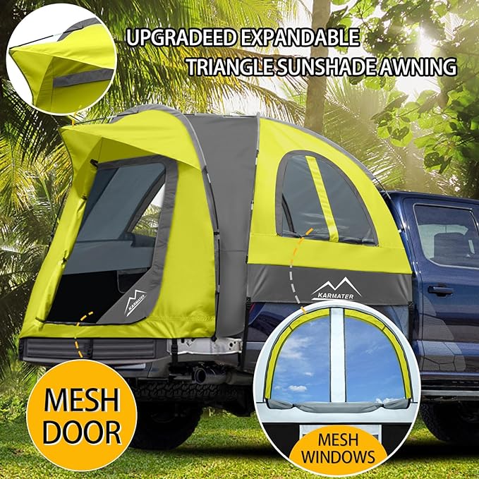 Pickup Truck Tent, Waterproof PU2000mm for Camping 5.5-6.5 Ft Bed, 2-Person Sleeping With Double Layer Design Windows, Expandable Triangle Sunshade Awning