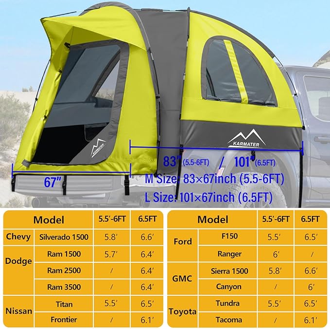 - 【Service】Our pickup tents Compatibility: The truck bed tent will fit for pickup truck with 5.5-6 ft bed. Compatible with F150, Ram, Silverado, Tundra, Sierra, Titan etc... they are extremely versatile and are undoubtedly a great choice for fishing trips, traveling, or festivals where a dedicated campground is unavailable. If you are unhappy with any aspect of our truck bed tent or if any parts are missing or damaged, contact us and we'll make it right.