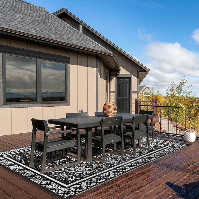 Outdoor Patio Plastic Straw Rug - 6'x9' Outdoor Camping Rug Waterproof Reversible, Area Carpet Patios Clearance RV, Outside Porch Balcony Deck for Camper, Classic Black & White