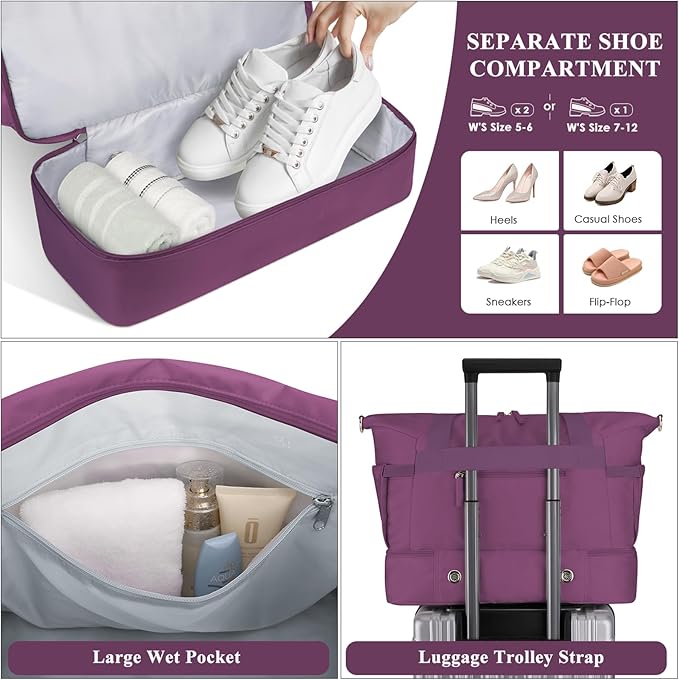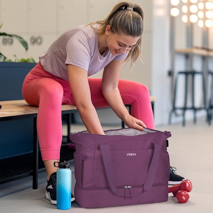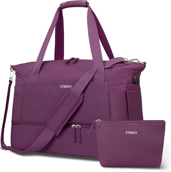 ETRONIK Gym Bag for Women, Travel Duffel Bag with USB Charging Port, Weekender Overnight Bag with Wet Pocket and Shoes Compartment for Women, Travel, Gym, Yoga (Grape Purple)