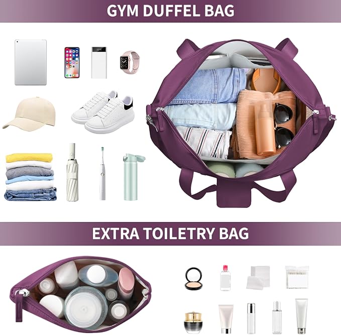 - Dry Wet Separate Duffel Bag:This duffle bag for women offers a spacious main compartment to store your clothes and items. A zippered waterproof PVC lined pocket for wet clothes or towels and swimsuits. In addition, this travel duffel bag also gives an extra small makeup bag for easy storage