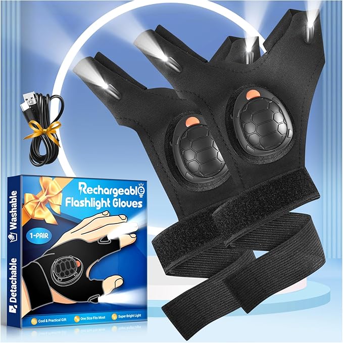 - Holiday Gifts Guide, Unique and Useful Gifts for Men/Women: Gift-wrap available rechargeable LED flashlight gloves are the right present for you! The lightweight gloves are ideal gifts for men, women, him, dad, father, husband, boyfriend, grandpa. The led flashlight gloves can be a wonderful gift on Christmas, stocking stuffers for men, anniversary, Valentine's or birthday for fishermen, handymen, plumbers, car lovers, electricians, engineers, night running and hiking lover, maintenance workers.