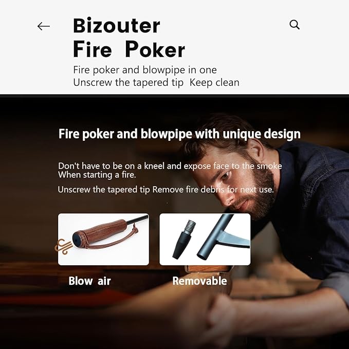 - FIRE POKER and BLOWPIPE IN ONE: Unscrew the tapered tip Keep clean.Firepit poker for outside pits,Portable and 2-PART ASSEMBLY Outdoor Firepit tool can be used in the patio, backyard, porch, or at the campground.The fire poker Detachable Design Makes It Easy To Pack For Camping Or Hiking.