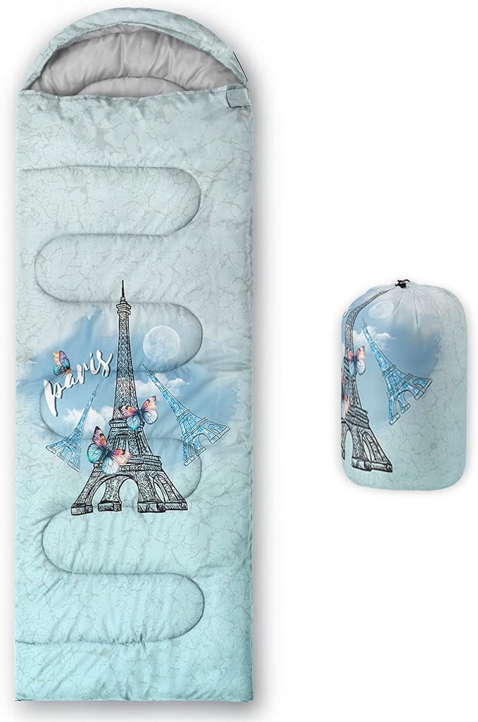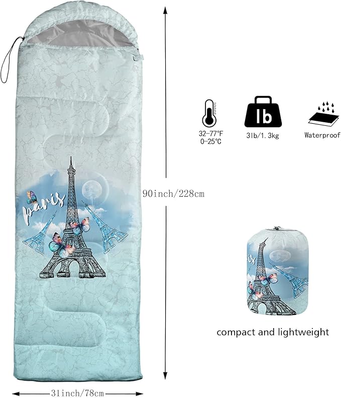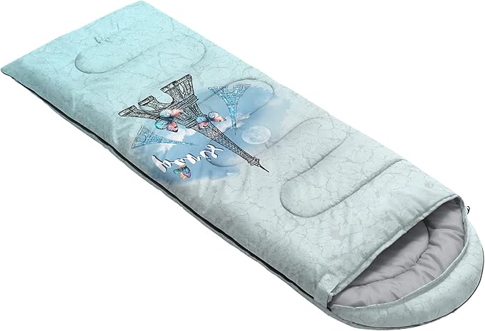 - SUITABLE:The sleeping bag can be used for 3 Seasons.SIZE:90.5"L x 31.5"W Suggenal extreme temperature: 41 ℉ -77 ℉.Applicable in a variety of scenarios,such as Travel camping pajamas party,It's very suitable for you to travel with your children.Half-circle hood with adjustable drawstring,which can keep you warm and prevent your humidity