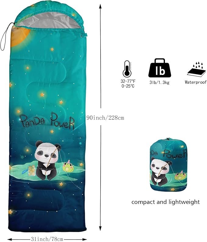 - SUITABLE:The sleeping bag can be used for 3 Seasons.SIZE:90.5"L x 31.5"W Suggenal extreme temperature: 41 ℉ -77 ℉.Applicable in a variety of scenarios,such as Travel camping pajamas party,It's very suitable for you to travel with your children.Half-circle hood with adjustable drawstring,which can keep you warm and prevent your humidity