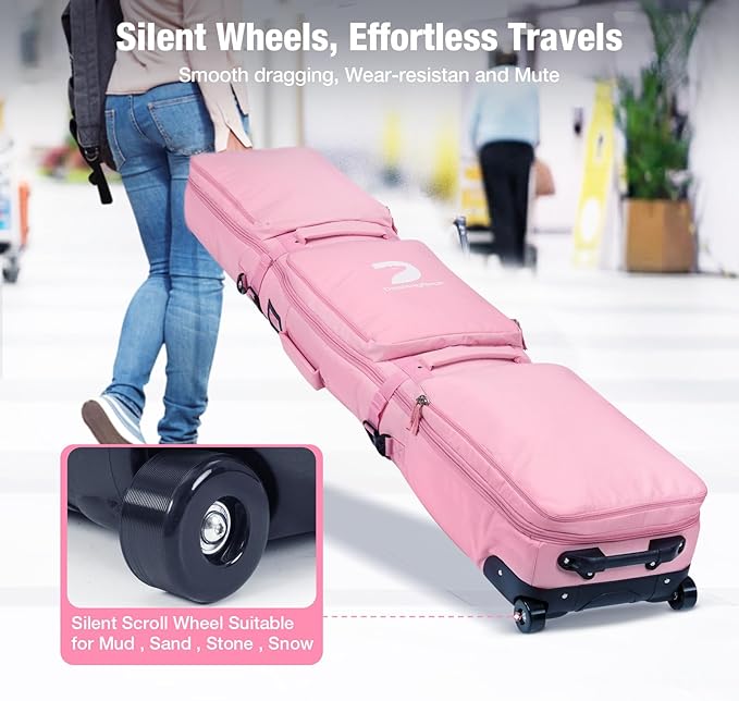 - SILENT WHEELS, EFFORTLESS TRAVELS: The snowboard bag with wheels makes it a breeze to roll your gear through the airport, parking lots, or snow-covered terrain, especially when equipment is heavy. The quiet wheel design minimizes noise so that it won't disturb anyone around you