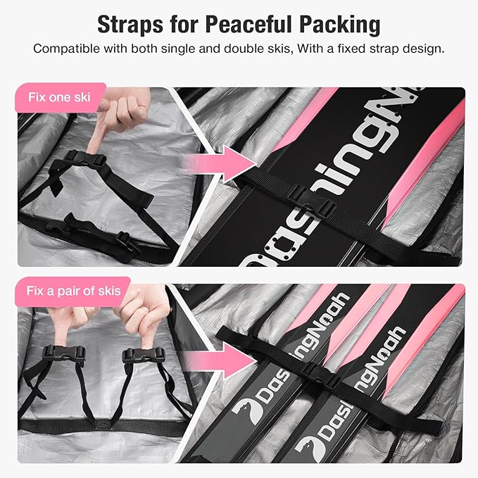 - STRAPS FOR PEACEFUL PACKING: Equipped with an internal dual-strap binding system, the padded ski bag securely holds a snowboard or two sets of skis. The sturdy buckles ensure a snug fit, preventing your skis from knocking against each other during transport