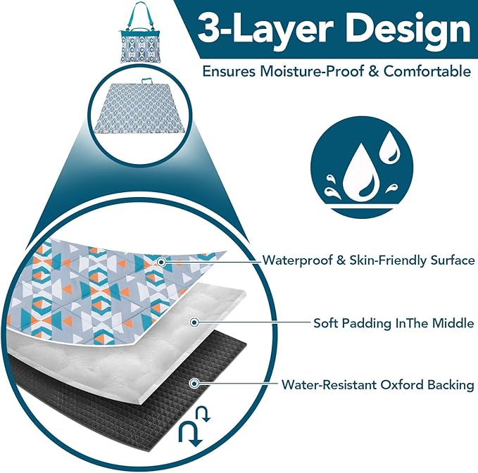 - 【Durable 3-Layer Design】Constructed with 3 layers, sturdy & skin-friendly polyester on top, soft padding in the middle and waterproof Oxford on backing. Thicker design along with 4 corner pockets (can be filled with sand or rocks) will keep our picnic mat grounded against wind, which also offers you extra sitting comfort, unlike other thin beach blankets.