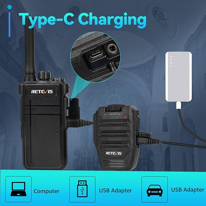 - Rechargeable speaker microphone; equipped with a Type-C charging interface and charging cable; allows speaker microphone to be charged through various methods; such as adapter and power bank