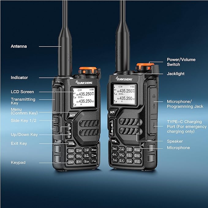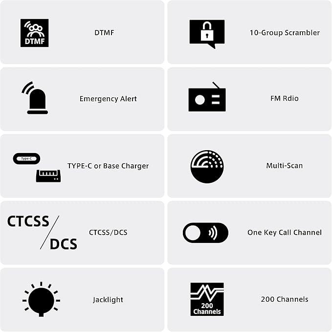 - Basic Functions: DTMF/10-Group Scrambler/Emergency Alert/FM Rdio/TYPE-C or Base Charger/Multi-Scan/CTCSS/DCS/One Key Call Channel/Jacklight/200 Channels/H&M&L Power/Wide&Narrow Band/1600mAh Li-ion Battery/VHF: 144-148MHz&UHF: 420-450MHz