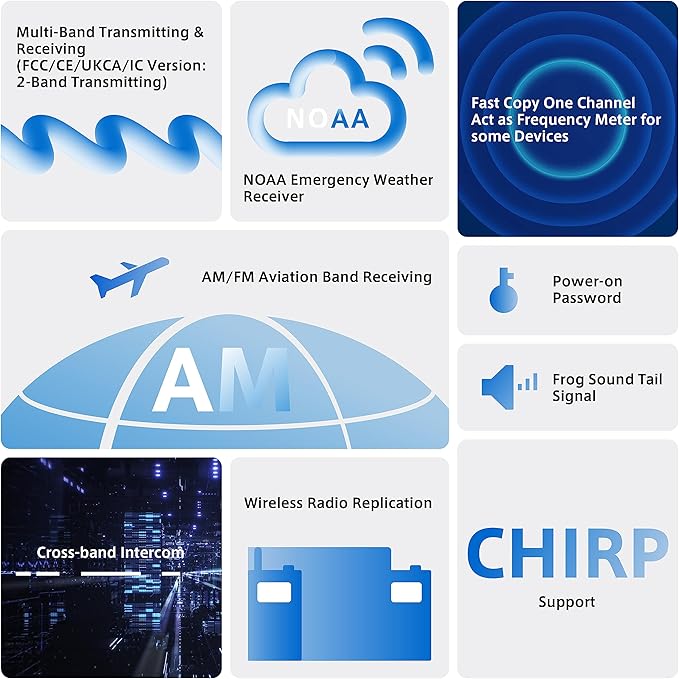 - Caption Functions: Multi-Band Transmitting&Receiving (FCC/CE/UKCA/IC Version: 2 Band Transmitting)/Fast Copy One Channel/Act as Frequency Meter for some Devices/Wireless Radio Replication/AM&FM Aviation Band Receiving/Frog Sound Tail Signal/Cross-band Intercom/NOAA Emergency Weather Receiver /Power-on Password/Support CHIRP