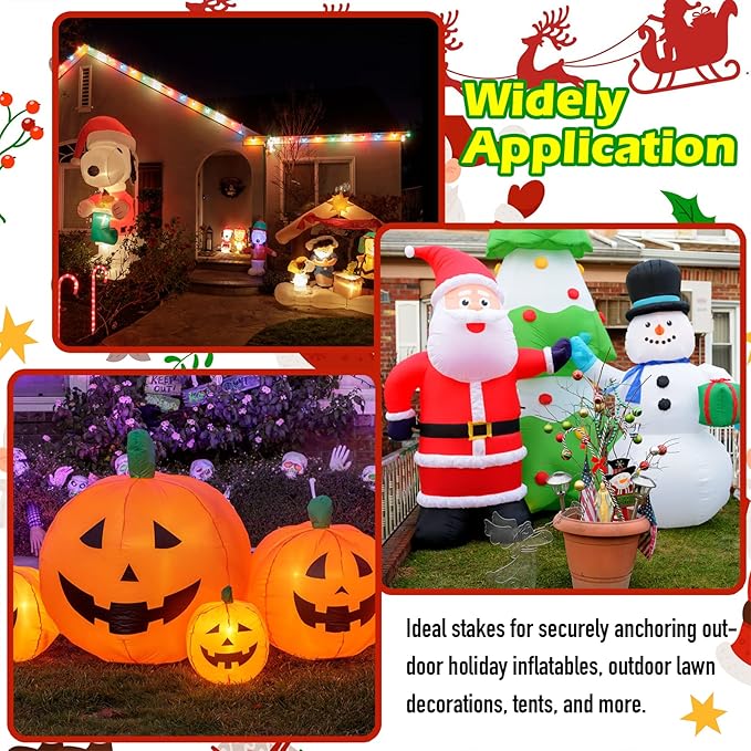 - Versatile Tent Stakes: The tent stakes are perfect for securing tents, canopies, tarps, inflatable decorations, and so on. They are tent accessories, camping accessories, and inflatable decoration accessories. Suitable for outdoor camping, hiking, inflatable decorations, beach trips, and more. Bringing you a lot of convenience. They can secure inflatable pumpkins, Santa, and snowmen on Halloween and Christmas, creating a welcoming atmosphere for friends, family. Long-lasting and reusable