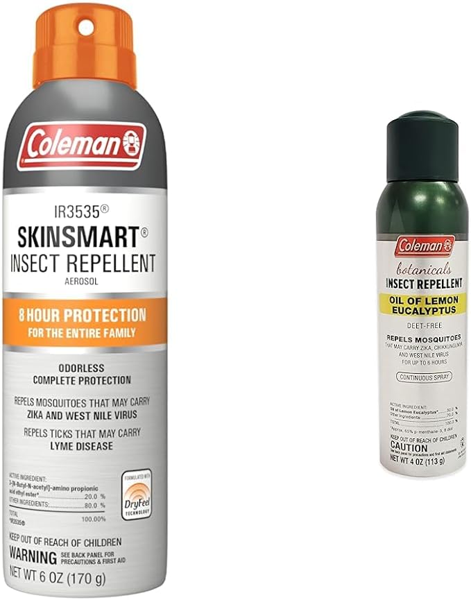 - Includes one 6oz can of Coleman SkinSmart DEET Free Insect Repellent and one 4oz can of Coleman Botanicals DEET Free Lemon Eucalyptus Insect Repellent.