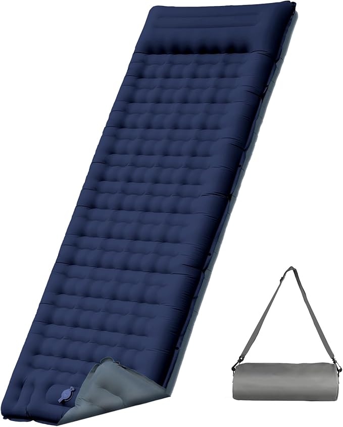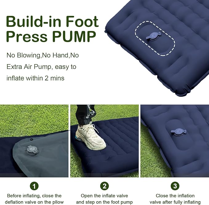 - 【Build_in Foot Pump & Pillow】Our camping mat features with built-in pump, no mouth blowing, free of you hands, no extra pump,it takes only 2 mins or so to fully inflate this thick sleeping pad by foot pressing. There is also an intergrated pillow designed to relieve back and neck pressure, perfect for hiking, camping, backpacking, traveling and other outdoor activities. Note:Please remember to close the deflation valve tightly on the pillow before inflation.