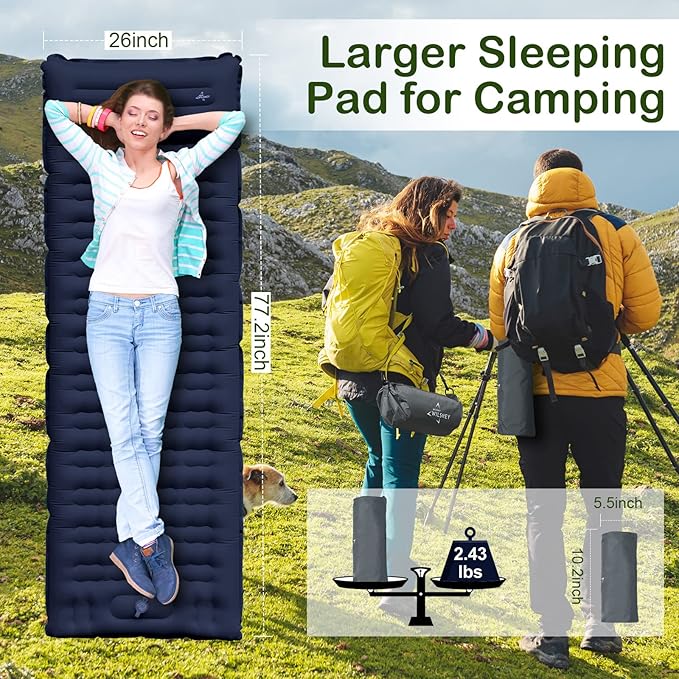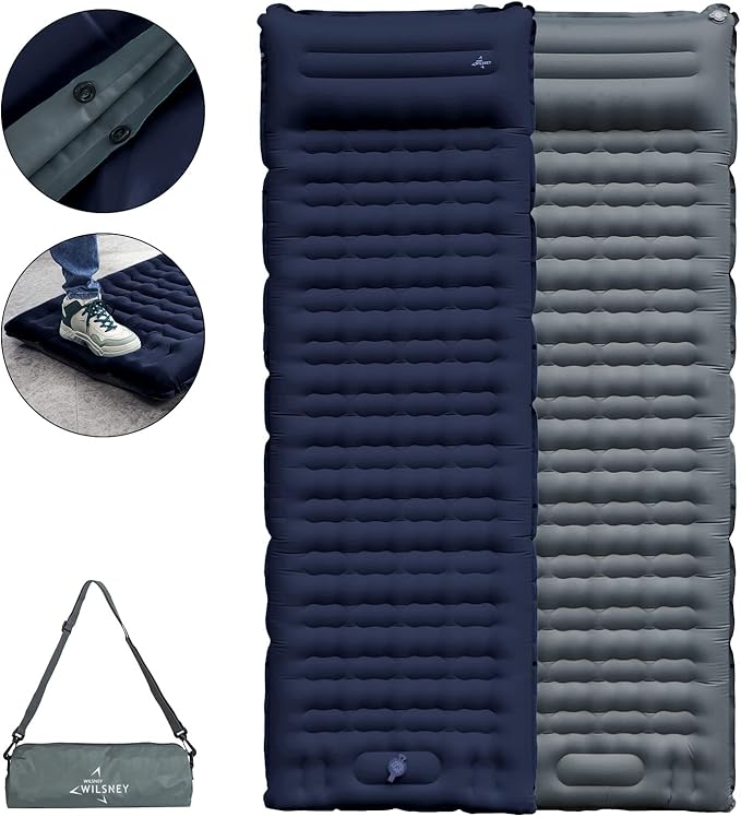 - 【4.7" Extra Thick for Most Comfort】Wilsney Wide sleeping pad measures 77.2"*26"*4.7" after inflation, compared to other cheap thin sleeping mats, this 4.7 inch ultra-thick self inflating sleeping mat will keep you off rough ground and insulating the coldness, ensuring maximum comfort and warm for your sleeping at all night. A great companion while camping.