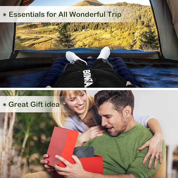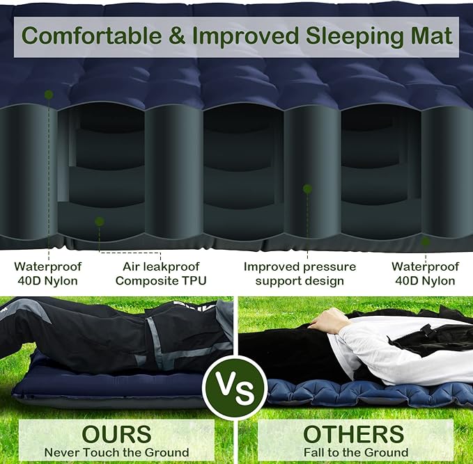 - 【Durable Material & Sturdy Inner Structure】This camping sleeping mat is made of 40D nylon material and TPU airtight coating for sturdy usage. The innovative built-in drawstring design can distribute the pressure evenly, ensuring your body balance and superior comfort, suitable for back sleepers, side sleepers, stomach sleepers.