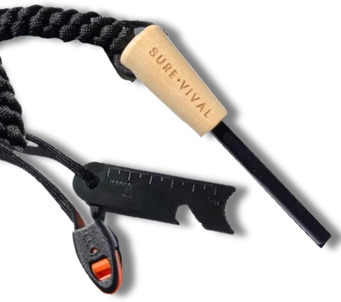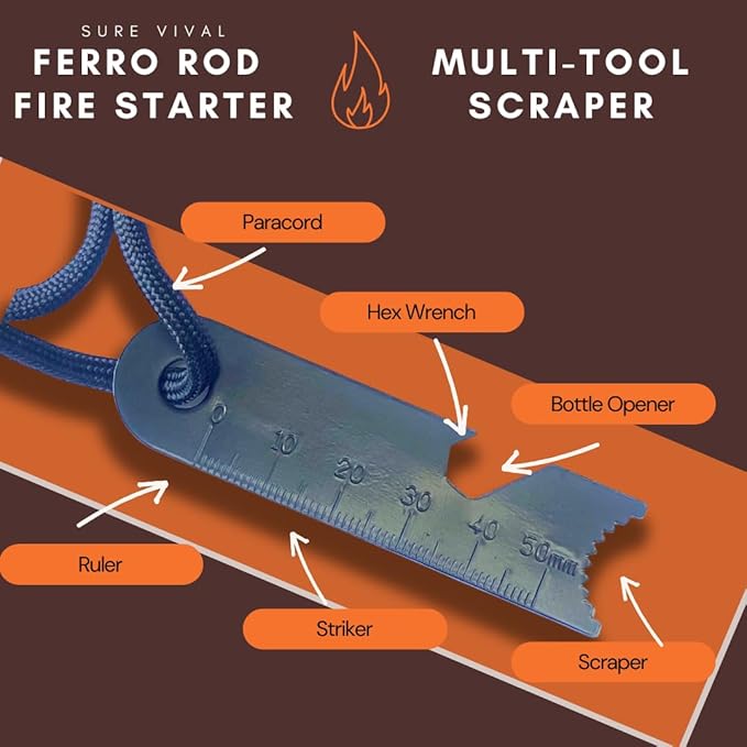 - MULTI TOOL FUNCTIONALITY: The integrated multi tool adds versatility to the fire starter, featuring a bottle opener, hex wrench, ruler, and scraper, attached with a paracord lanyard and emergency whistle. It's a handy addition for various outdoor tasks and survival situations.