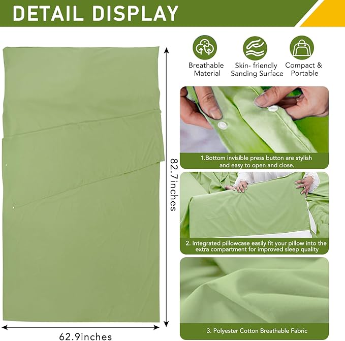 - Clean and hygienic: The sleeping bag liner can be used for sleeping bags to keep them dry and clean. The integrated pillowcase provides extra protection and comfort. This sleeping bag liner is lightweight and easy to clean as we can hand wash or machine wash it. Dries quickly in the tumble dryer, making it a top choice for travel linens.