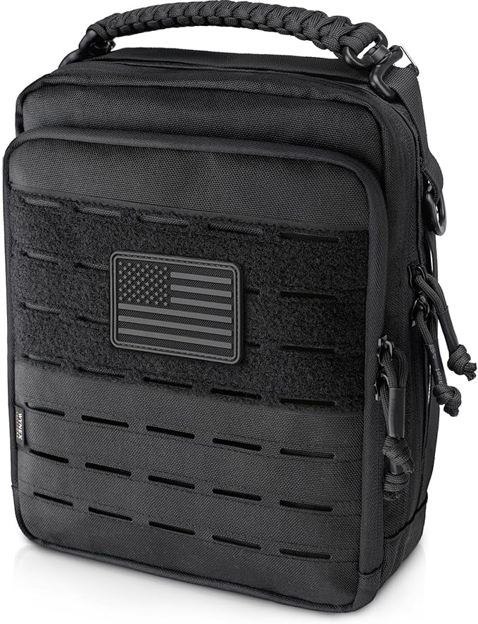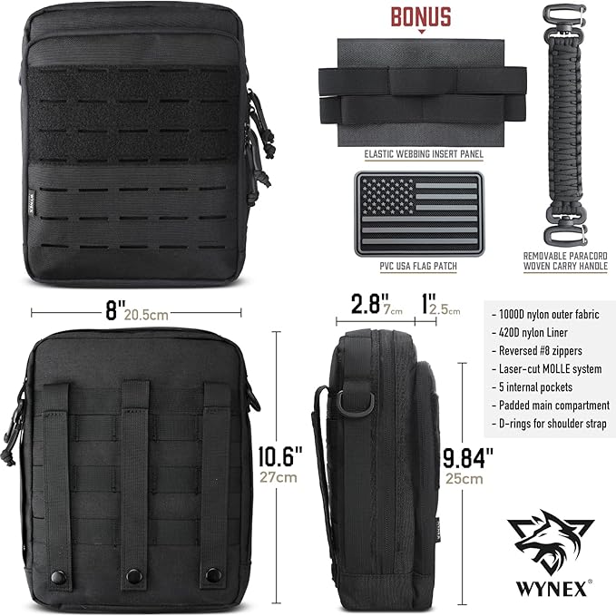 - THREE WAYS TO CARRY: Tactical Admin Pouch features three vertical back straps with metal snaps compatible with all Molle/PALS system like tactical backpacks and vests. Three exterior webbing straps for vertical/horizontal carry with removable paracord woven carry handle. You can use the shoulder strap (NOT Included) to attach 2 D-rings for hands-free.