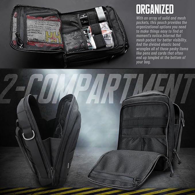 - VERSATILE SECTION ORGANIZATION: Molle Admin Pouch's main compartment features a large loop field(7"L x 7.8"H/17.8*20cm), allowing you to customize your gears to your needs with elastic webbing insert panel. A Nylon pocket via Hook-N-Loop strap closure, a mesh pocket with surface elastic band design for organizing EDC gears while carrying your iPad Pro, and flap barriers at the two sides to prevent items from falling out.