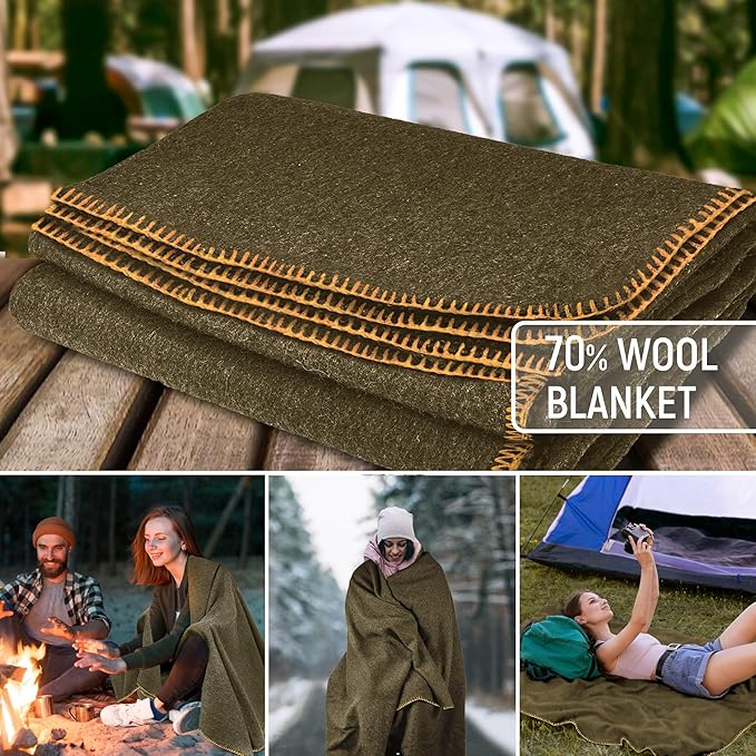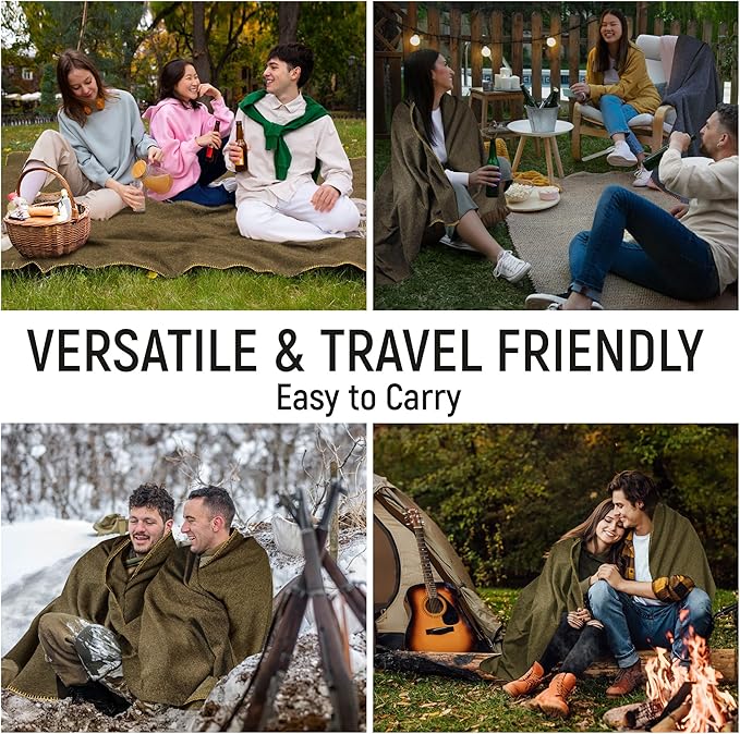 - 🛖【MULTI-USE WOOL BLANKET - HOME TO CAMPSITE】 This versatile Wool Blanket serves multiple purposes: Car Blanket, Picnic Blanket, fire pit companion, indoor fireplace comfort, and Camping Blanket. Perfect for cozy nights at home or outdoor adventures, it offers comfort and warmth while meeting military-grade durability standards.
