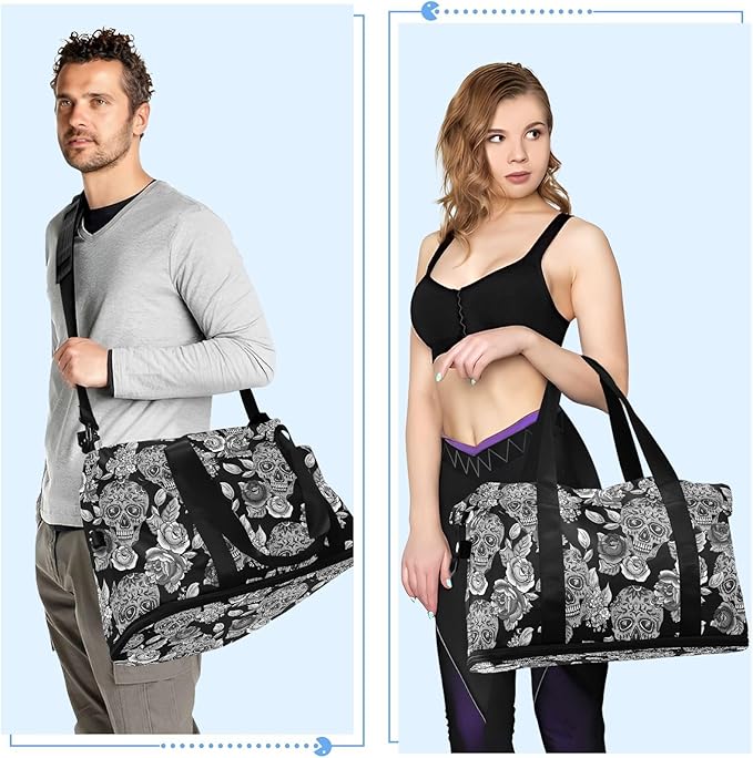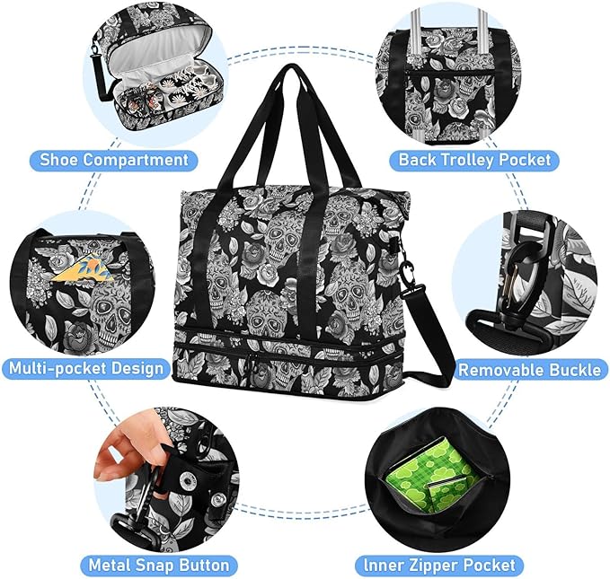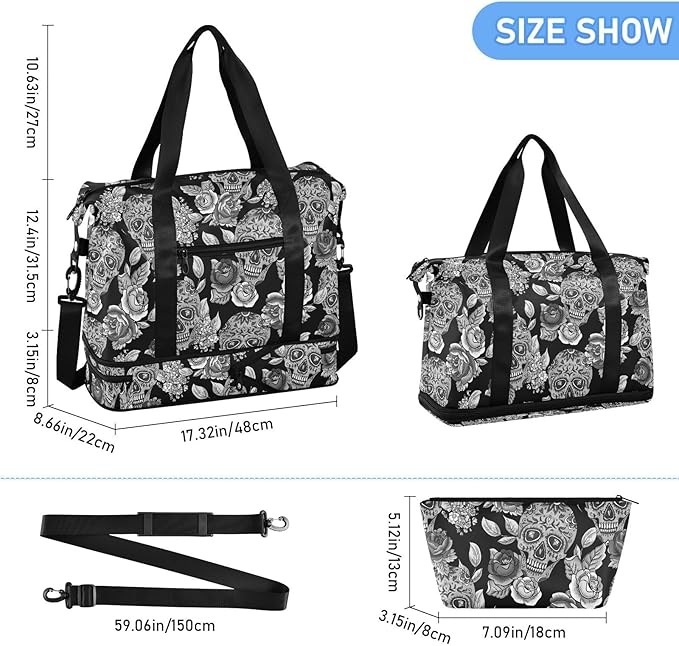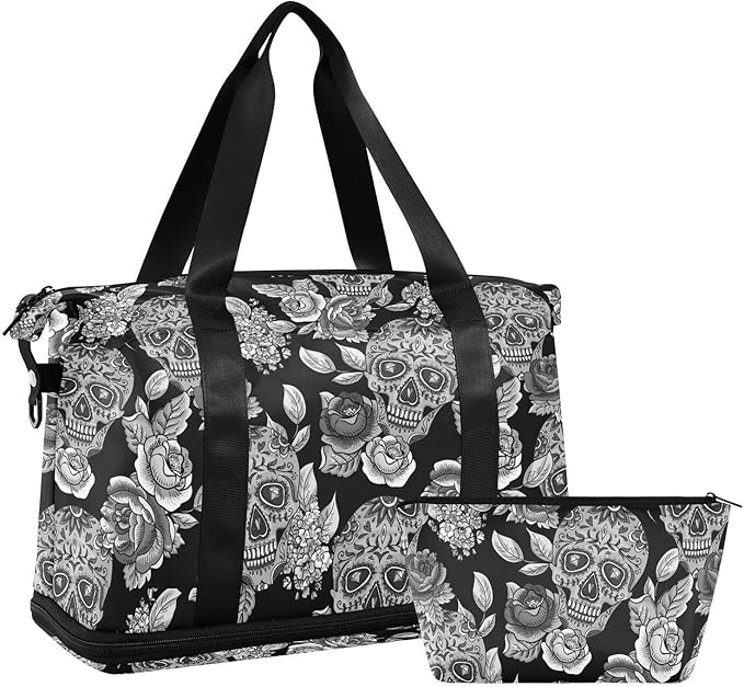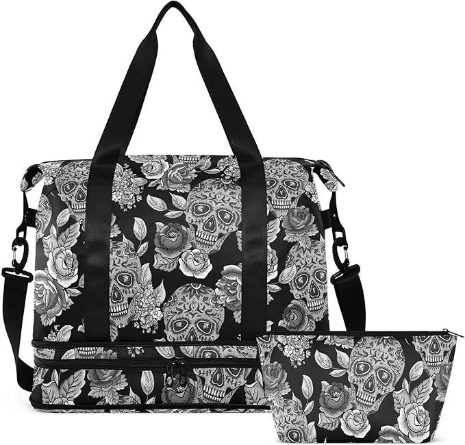 Skull Weekender for Women, Gym Sports Duffle With Flowers, Travel Tote With Toiletry Bag, Shoes Compartment, Dry/Wet Separation Swim Bag