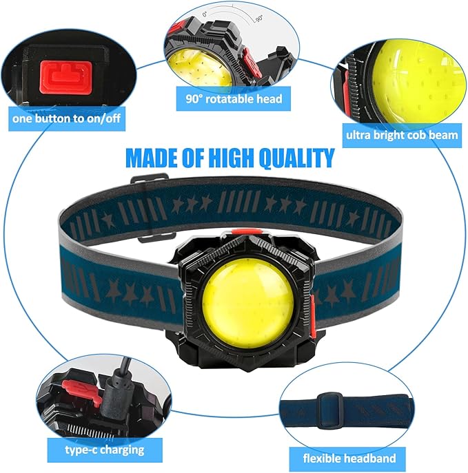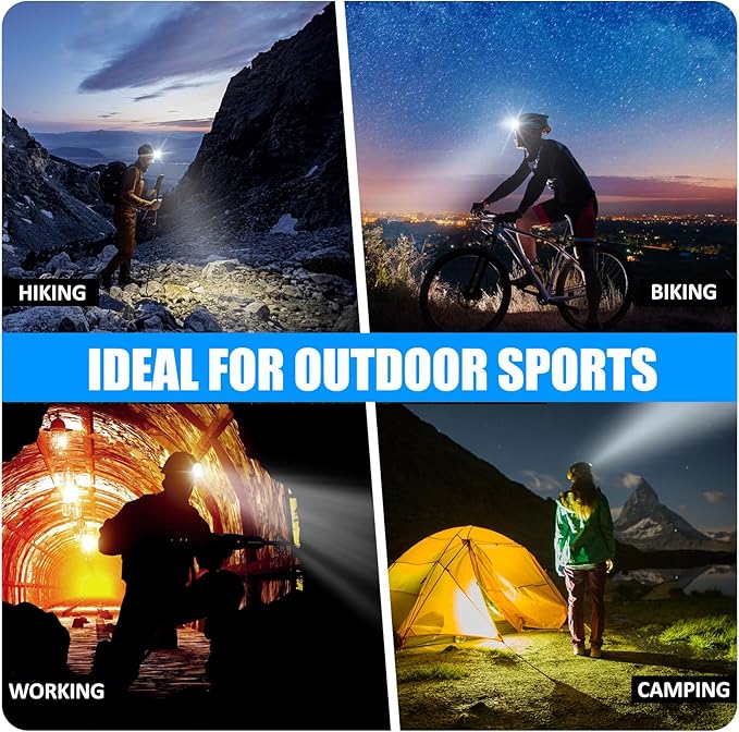 - Super Bright: Headlamp Rechargeable features COB LED beads and supplies 1000 lumens brightness, which is a perfect lighting solution for outdoor activities. Whether you're camping, hiking, running, or cycling, our headlamp ensures that you can see clearly even in the darkest environments.