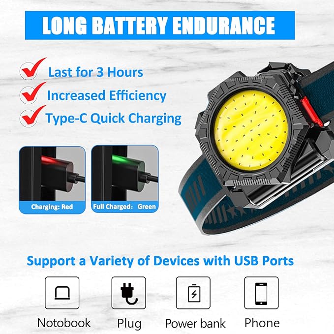 - Type-C Charging: This rechargeable headlamp can provide up to 3 hours of continuous use on a full charge, making it perfect for extended camping trips, outdoor adventures, or emergency situations. It's equipped with the latest Type-C charging for fast and convenient recharging.