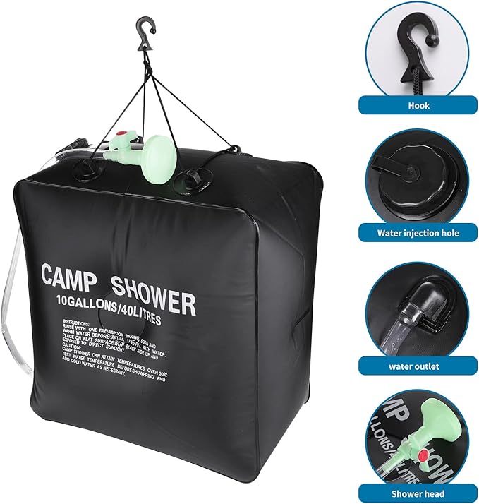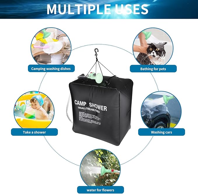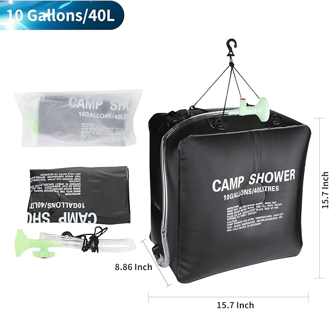 - 【10 Gallons of Water】Solar camping shower has large 10-Gallon/40 Liters water capacity, enough water for multiple showers.