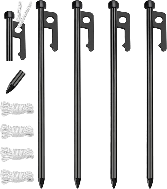 - Versatile Use: Our camping stakes are versatile and ideal for securing tents, awnings, canopies, tarps, and outdoor equipment during camping, hiking, and other outdoor adventures.With a pack of 4 camping stakes , you can use them not only for your tent but also for other purposes such as securing a rainfly, guylines, or even setting up a tarp shelter.