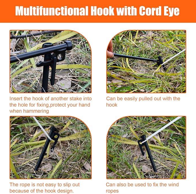 - Easy Tips for better use: - Please do not nail the tent stake vertically to the ground. - Make the tent stake and the ground into a 60-degree angle. - Please leave about 1.6 inches (4cm) of the tent stake on the ground to have enough room to tight the rope. - Use the hook to tight the rope. - Use the hole to pull out the tent stake.to Use: The big flat round head design makes it easy to hammer down into the ground, and also you can pull it out easily by the puller.