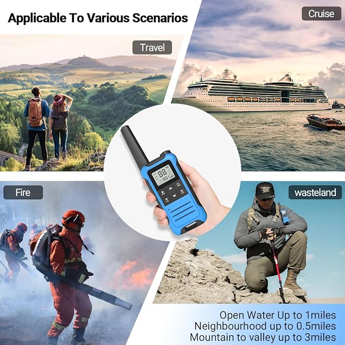 - 【Multi-scene application】Walkie talkies long range can reach 3 miles in open areas.If there are buildings, the working range will be reduced.Two way radio for adults, palm-sized, strong material and resistant to falling, rain-proof, very suitable for various application scenarios such as: road trip,warehouse,cruise ship,outdoor picnic, camping, riding, hotel management, warehouse, building construction, restaurant, school Playground and church.