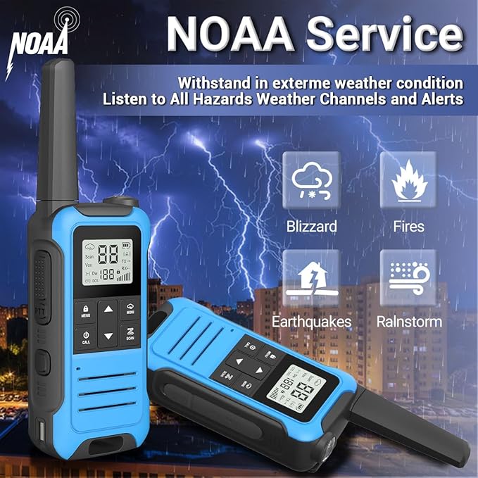 - 【NOAA Weather Alert】 The adult walkie talkie supports NOAA weather service. It can scan 12 NOAA Weather channels. When you turn on the weather alarm function, the two-way radio will give an alarm if there is a risk of bad weather. Gives you plenty of time to deal with disasters such as Tornadoes, Hurricanes, Thunderstorms, Floods, Earthquakes, etc. This is a necessity for life safety.
