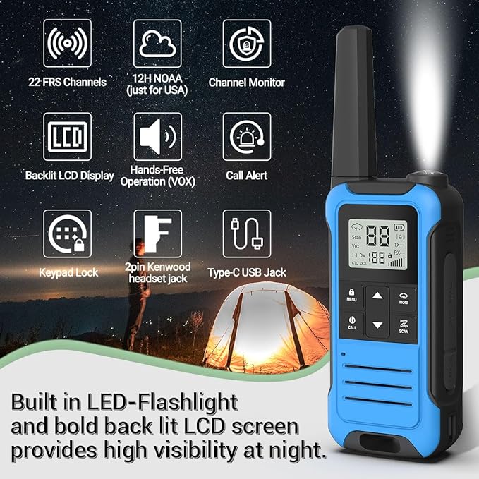 - 【Multi-function】The large flashlight can meet your night lighting, the portable frs two-way radio has weather alarm, which is suitable for your outdoor travel, and also has 22 channels, 12 NOAA channels, dual monitoring mode, channel scanning, 155 privacy codes, call function and 8 ring tone options, VOX hands-free function and HD audio quality, as well as Keypad Lock, Backlit LCD Display, Low Battery Audible Alert, 2Pin Kenwood headset jack, Type-C USB connector for charging.