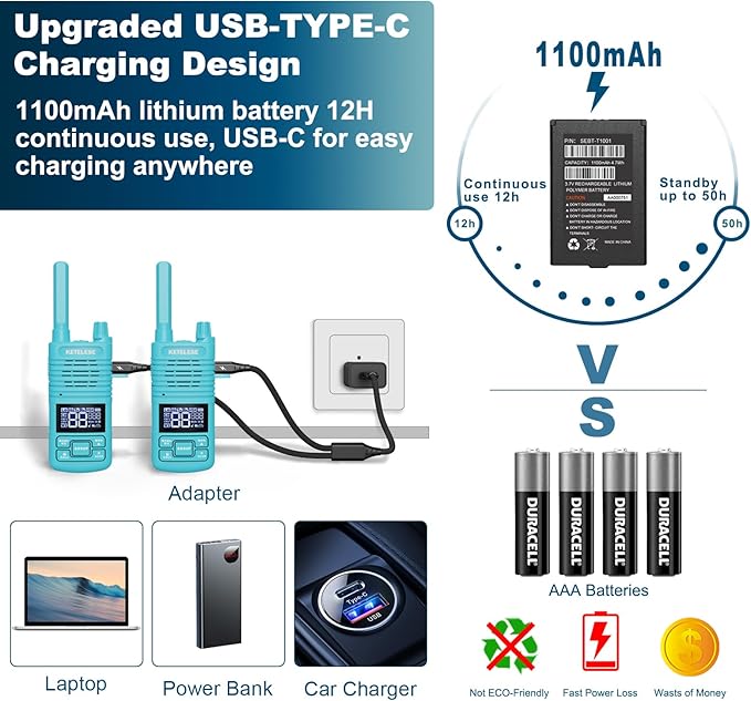 - 【High-Quality After-Sales Service】 3-year warranty. Complete accessories include 2 FRS Radios, 2 Earpiece, 2 Li-Polymer Batteries, 1 Dual Port TYPE-C USB Charger Cable, 1 AC Adapter, 1 User Guide. 2-piece set of radio walkie-talkies are also a great communication tool for men, women, kids, and elders to talk with others at home.