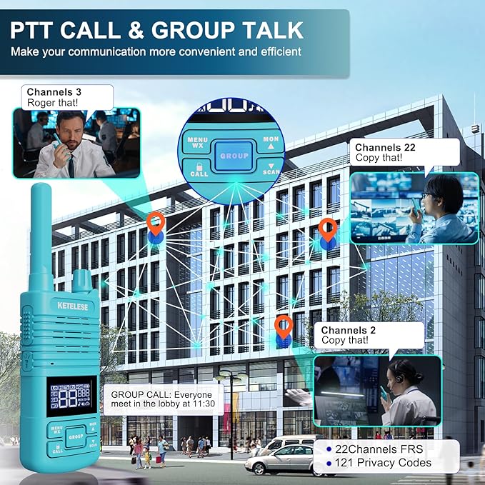 - 【Long Range and Private 】 This 2-watt portable walkie-talkie has clear and effective communication that can pass through a 25-story steel and concrete building. 22 FRS channels and 121 privacy codes, providing up to 2662 combinations to prevent other conversations.