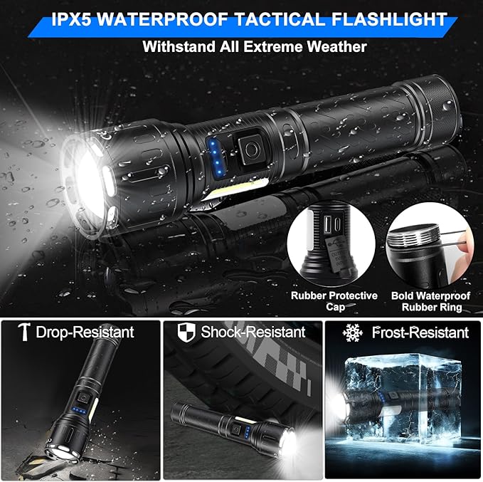 - 【PRACTICALLY INDESTRUCTIBLE & IPX5 WATERPROOF】The led tactical flashlight high lumen body is made of super hard aviation-grade aluminum alloy, impact resistance, wear-resistant and drop-resistant. It is strong enough to withstand a 10 feet accident drop and even ran over by a truck, it still works! IPX5 waterproof flashlight has a built-in high tenacity seal rubber waterproof ring, which can be used normally in any bad weather, such as rain or snow.