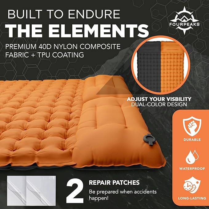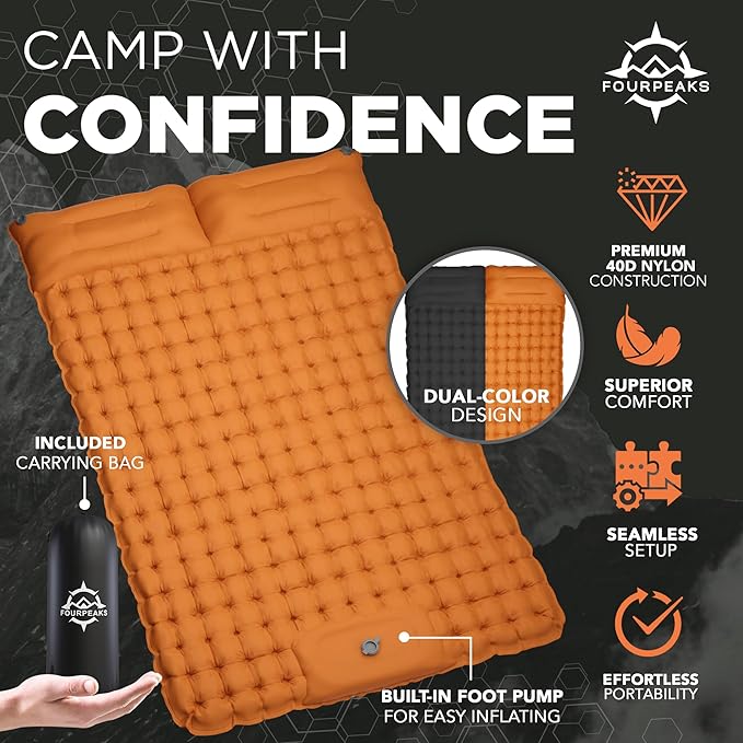 - DUAL-TONE DESIGN, the orange and black color combination of our double sleeping pad for camping let you choose if you want to stand out amongst nature, or keep your camping sleeping mat discreet and out of sight.