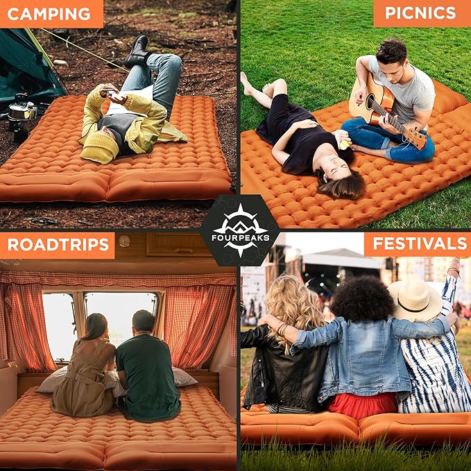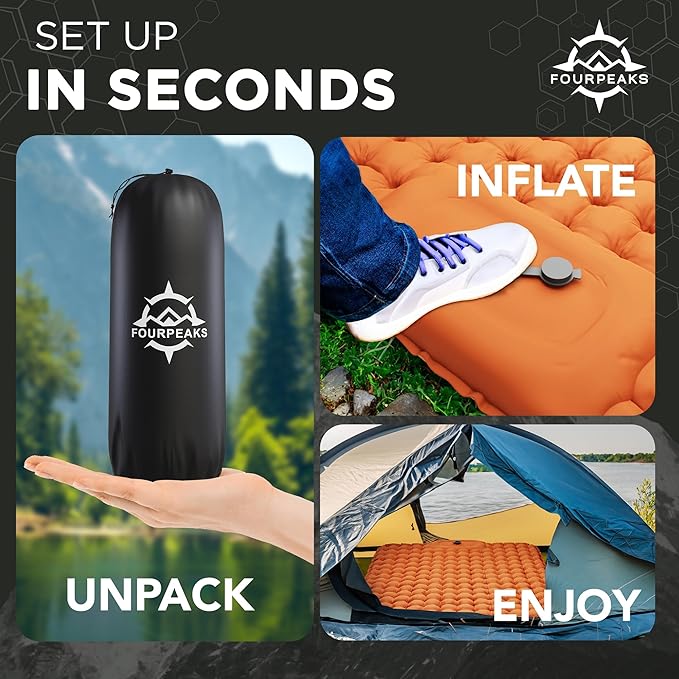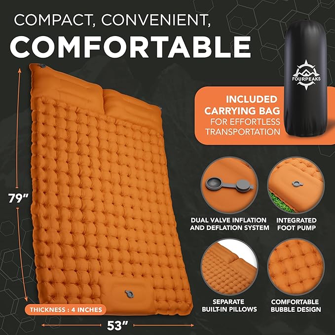 - EXPERIENCE ULTIMATE OUTDOOR COMFORT with the FourPeaks Sleeping Pad For Camping. These camping sleeping pads feature two integrated pillows, providing a soft place for your head and neck for a restful night's sleep.
