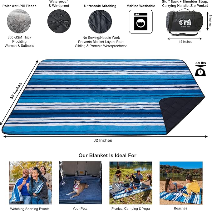 BRAWNTIDE Large Outdoor Waterproof Blanket - Quilted, Extra Thick Fleece, Warm, Windproof, Sandproof, Includes Stuff Sack, Shoulder Strap, Ideal for Beaches, Picnics, Camping, Stadiums, Dogs, Car