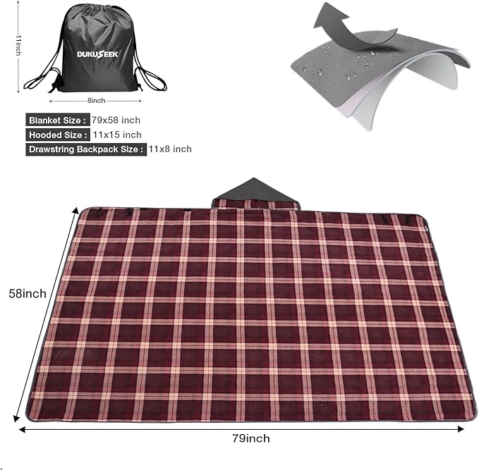 DUKUSEEK Stadium Blanket Waterproof Windproof, Outdoor Hooded Blankets for Camping, Sporting Events, Picnic and Car - Insulated Foldable Blanket and Throws, 79"x 59"