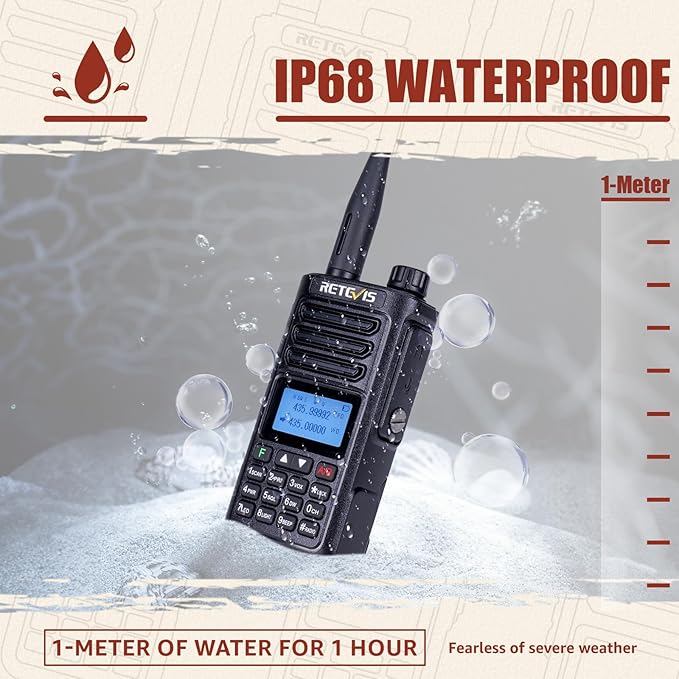 - IP68 waterproof two way radio; keep in 1 meter depth of water for 1 hour; provides great convenience for using the walkie talkie in severe weather