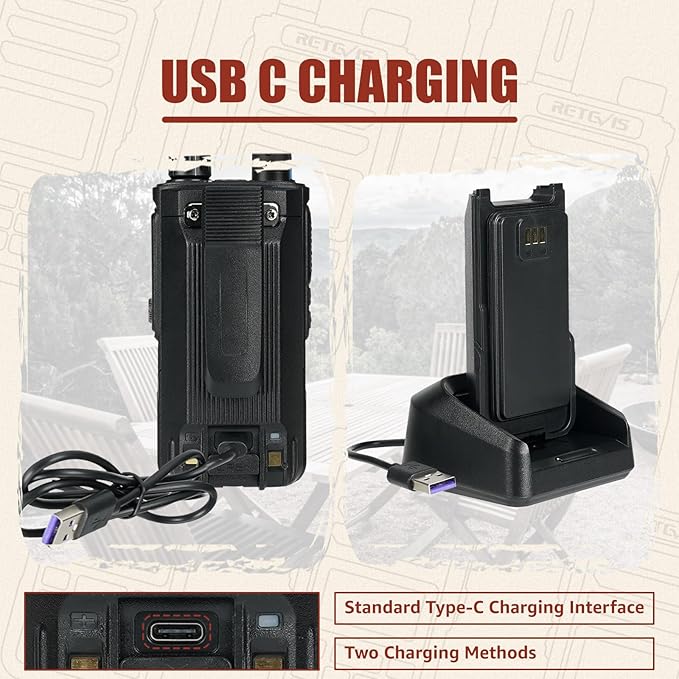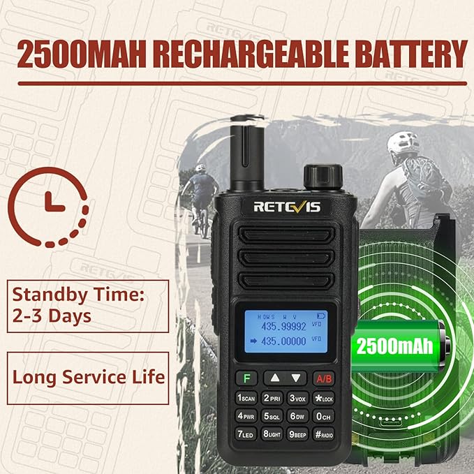 - 2500mAh rechargeable battery; 75 hours standby; long service life; facilitate all-day outdoor use; a standard type-C charging interface; convenient for recharging two way radio