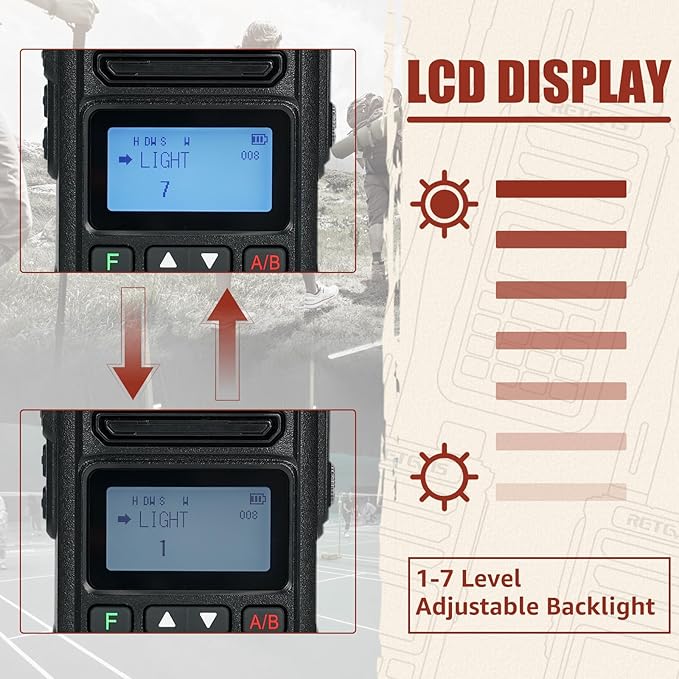 - 1-7 levels adjustable backlight brightness; whether you are in dim light or bright light; clearly get the working status of 2 way radio