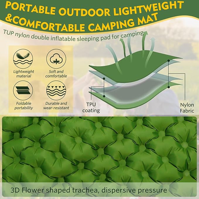 - ⛺【STURDY& PORTABLE CAMPING MAT】The camping mattress is made of double thickened 400D nylon and 300T Polyester pongee material. The excellent durability and tear resistance feature protects the sleeping pad for camping from scratched or tore. And TUP Inner Coating seals air in place, preventing air leakage, water infiltration and insulate the cold.